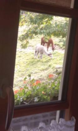 hier gibt es immer was zu sehen. Egal ob es unser Babyalpakas sind, die gerade spielen oder unsere Pferde die gemütlich vorm Haus grasen oder die Kühe die bei unseren Nachbarn gegenüber stehen. Irgendwelche Tiere gibt es immer zu beobachten.