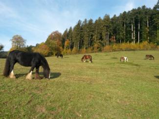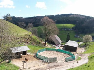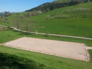 Direkt angrenzend befinden sich Waldwege zum Ausreiten. Wir haben einen Reitplatz 20x40m und einen Roundpen.